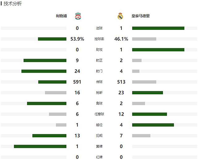 第43分钟,本泽马门前面对阿利森回敲,巴尔韦德和防守球员拼抢时将球弹出,本泽马面对来球抢射破门,通过VAR,裁判示意本泽马越位在先进球无效。上半场比赛结束,利物浦暂时0-0战平皇家马德里。