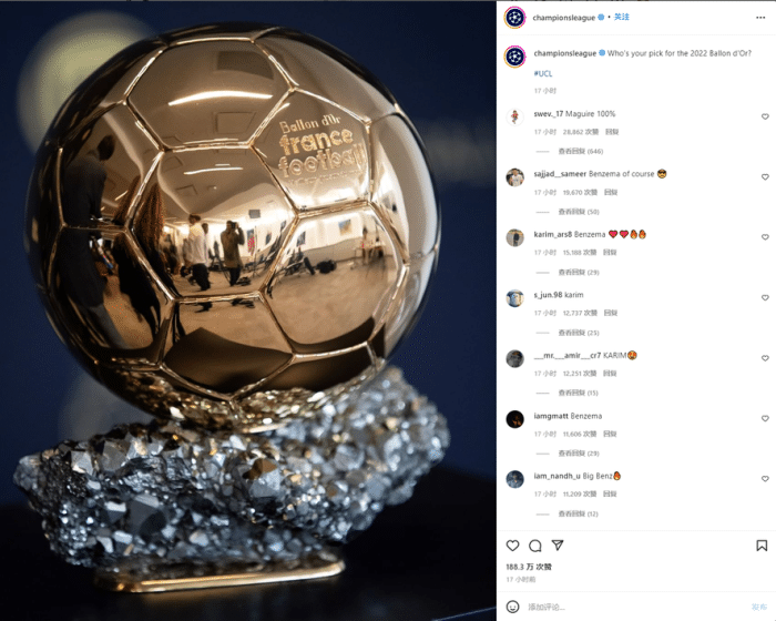 24直播网05月19日讯 欧冠官方Instagram账号今天发文询问球迷谁该获得今年的金球奖,马奎尔获得了最高赞。