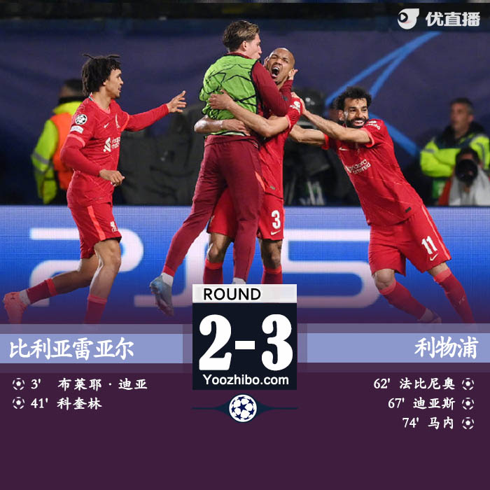 利物浦3-2总5-2黄潜 马内法比尼奥迪亚斯破门 进决赛