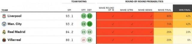 而大数据机构fivethirtyeight也更新了对本赛季欧冠的预测。他们也看好英超双雄会师欧冠决赛,利物浦更是有80%的机会晋级决赛,42%的机会夺冠。而曼城晋级决赛的概率为74%,42%的机会夺冠。