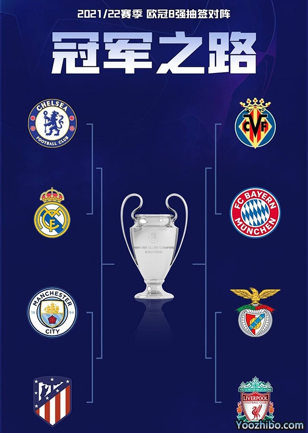 来源:24直播网03-18 20:0324直播网讯 北京时间3月18日,欧冠联赛1/4决赛抽签仪式进行,结果,皇马对阵切尔西,利物浦对阵本菲卡,曼城对阵马竞,拜仁对阵比利亚雷亚尔。上半区曼城和马竞的胜者对阵皇马和切尔西的胜者,下半区是利物浦拜仁所在的两组对阵。