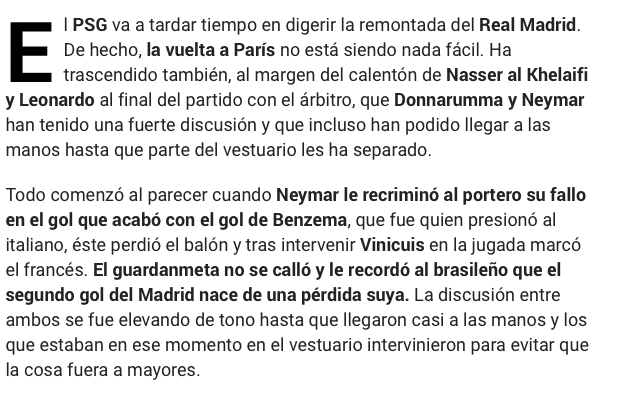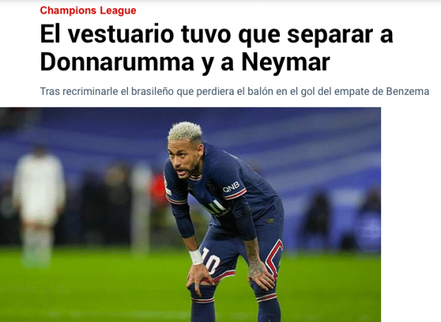 来自西班牙媒体《马卡报》的透露,在欧冠止步16强之后,大巴黎球员之间发生了内讧,内马尔在更衣室和意大利门将多纳鲁马,发生了激烈的争吵。