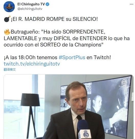 而在重新抽签结果无法更改之后,皇马俱乐部高层布特拉格诺,也在接受皇马TV的采访时回应了这次欧冠重新抽签,布特拉格诺气愤地表示:“今天(欧冠抽签)发生的事情令人感到惊讶、遗憾且非常难以理解。”