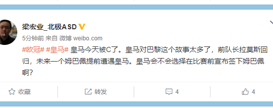 梁宏业:皇马今天被C了。皇马对巴黎这个故事太多了,前队长拉莫斯回归,未来一个姆巴佩提前遭遇皇马。皇马会不会选择在比赛前宣布签下姆巴佩啊?