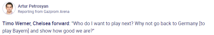 24直播网12月09日讯 今天凌晨,切尔西在欧冠小组赛末轮3-3平泽尼特,以小组第二身份晋级16强,赛后被问到希望接下来抽到谁时,维尔纳表示可以抽拜仁。