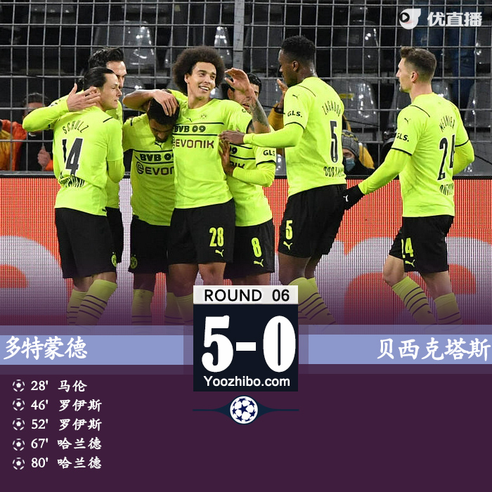 全场比赛结束,多特5-0大胜贝西克塔斯。