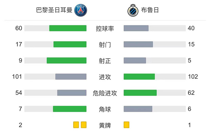 下半场伤停补时3分钟,全场比赛结束,最终巴黎圣日耳曼4-1击败布鲁日。