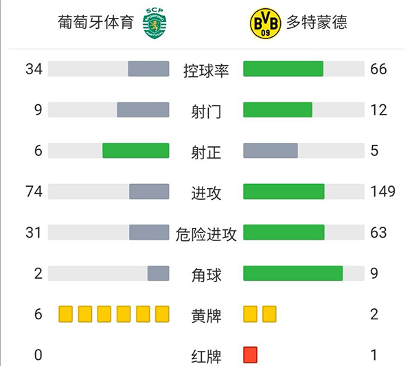 全场比赛结束,葡萄牙体育3-1多特蒙德。