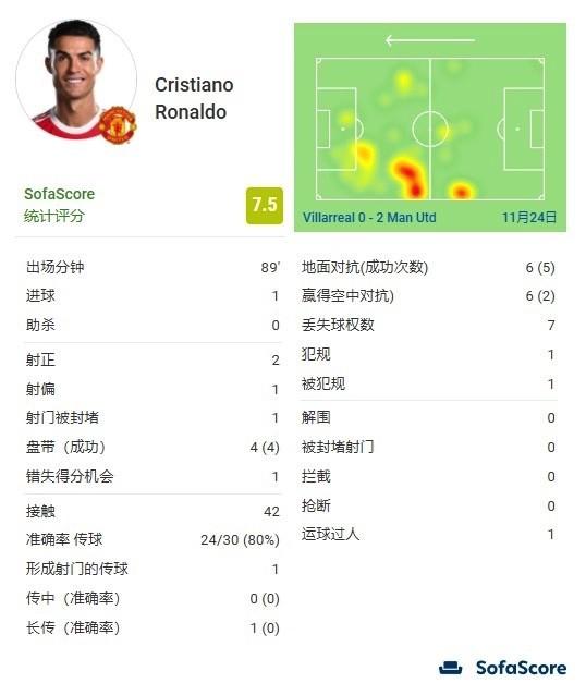 根据赛后的数据统计,C罗本场比赛4次射门2次射正,4次过人全部成功,触球42次传球30次,创造了1次机会。地面对抗6次赢下了5次,而权威外媒sofascore也给他打出了7.5的高分。赛后,C罗毫无悬念地当选欧足联官方全场最佳球员。