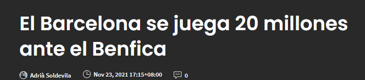 如果欧冠小组未能出线,巴萨将损失2020万欧。晋级16强有960万欧的收入,晋级8强则有1060万欧。因此巴萨本轮对本菲卡的比赛至关重要,他们目前积6分排名小组第二,本菲卡积4分,但首回合3-0大胜巴萨。