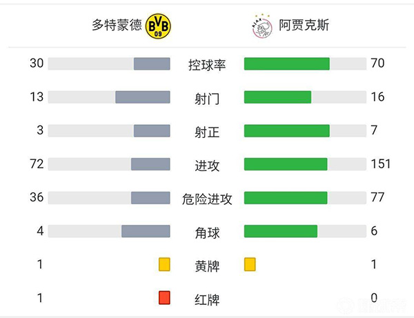 全场比赛结束,多特主场1-3不敌阿贾克斯。