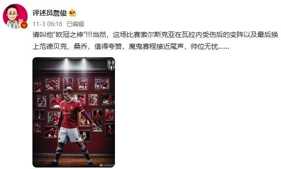 其实不仅是本场比赛,本赛季曼联前3轮欧冠比赛也都是C罗在“扛着”曼联前进。赛后,曼联主帅索尔斯克亚在接受采访时激动地表示:“C罗简直不可思议,C罗就像公牛队的乔丹。当你遇到一个机会、一个难得的机会,需要给到某个人时,C罗总是不可思议的。”而负责本场比赛解说的国内知名评论员詹俊,都忍不住在社交账号上盛赞葡萄牙巨星:“请叫他‘欧冠之神’!