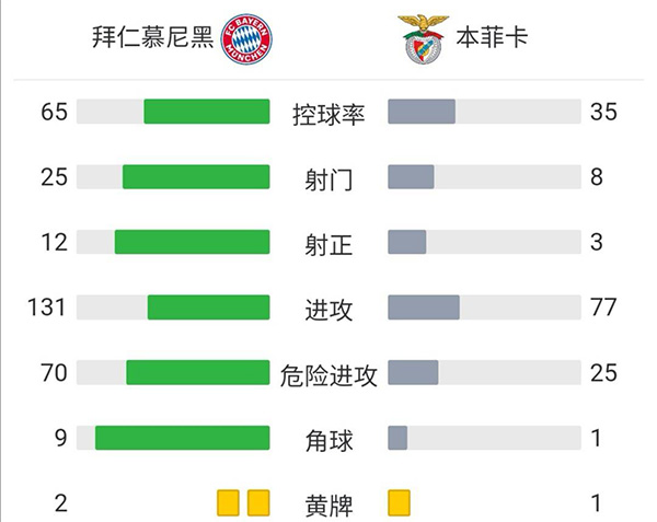 全场比赛结束,拜仁慕尼黑5-2战胜本菲卡。