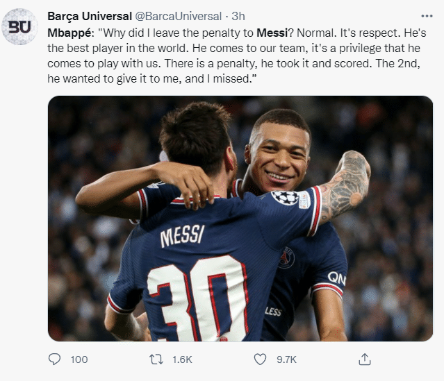 姆巴佩说道:“让出点球很正常,因为梅西是世界最佳。他来到这里和我们一起踢球,我们感到很荣幸。”