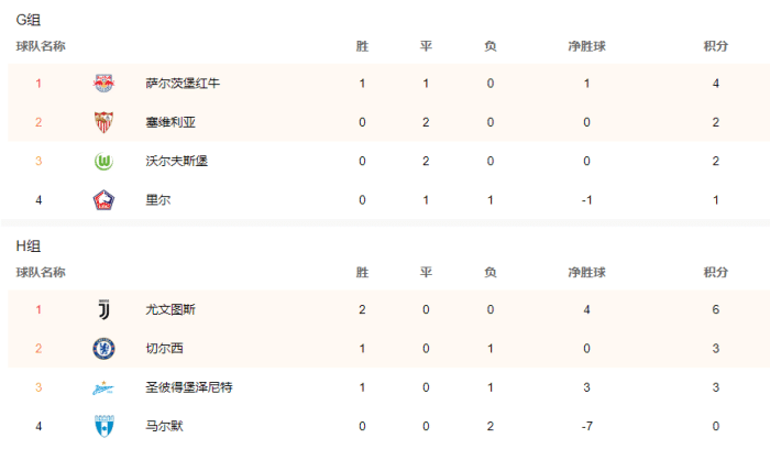 F组的亚特兰大1-0伯尔尼年轻人、曼联2-1比利亚雷亚尔;G组的萨尔茨堡红牛2-1击败里尔、沃尔夫斯堡1-1塞维利亚;H组的尤文图斯1-0击败切尔西、泽尼特4-0击败马尔默。本轮过后,欧冠最新积分形势出炉,前两轮表现最糟糕的豪门球队是欧冠7冠王AC米兰和欧冠5冠王巴塞罗那,AC米兰先后2-3输给利物浦、1-2输给马竞,排名B组倒数第一名,不过球队依然看到了复苏的迹象,惜败给利物浦和马竞都是能接受的结果。