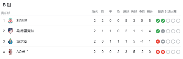 B组利物浦5-1狂胜波尔图,2战2胜6分排第一,马竞2-1逆转击败十人应战的AC米兰积4分排第二。波尔图1分排名第三,米兰接连憾负利物浦和马竞后0分垫底。