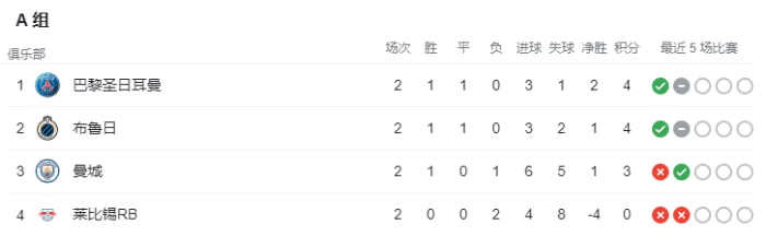 A组方面,巴黎主场2-0击败曼城,布鲁日客场2-1逆转莱比锡,目前巴黎1胜1平4分因净胜球优势排第一,布鲁日同分排第二,曼城3分排第三,莱比锡0分垫底。