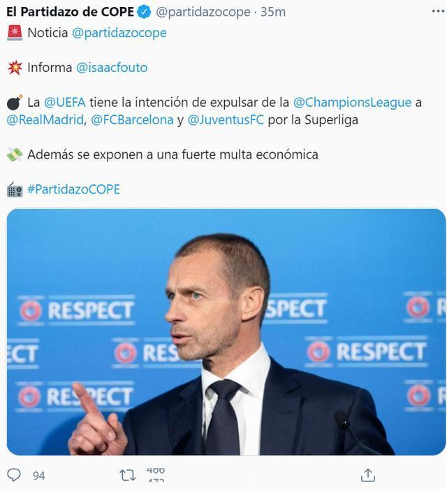 24直播网讯 据科贝电台消息,欧足联打算将皇马、巴萨和尤文踢出欧冠联赛,并对他们处以巨额罚款。