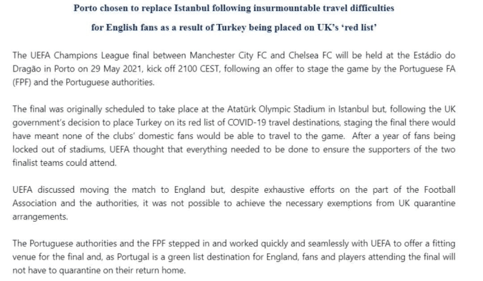 欧足联官方表示,曾考虑将比赛移至英格兰,但是尽管欧足联和地方足协做出了努力,但仍无法获得英国检疫部门的豁免。而葡萄牙政府当局介入,能与欧足联迅速、无缝地合作,为决赛提供合适的场地,由于葡萄牙是英格兰的安全名单中的地区,因此参加决赛的球迷和球员回国后不必隔离。