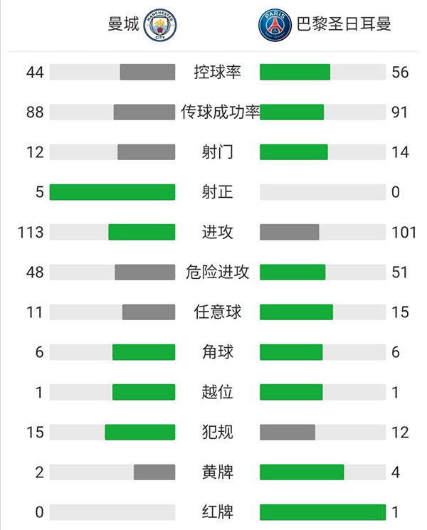 全场比赛结束,曼城2-0战胜巴黎圣日耳曼,总比分曼城4-1巴黎晋级欧冠决赛。