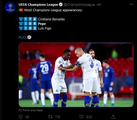 本场登场之后,佩佩以104次出场超越菲戈,成为葡萄牙欧冠出场次数第二多的球员,仅次于176次出场的C罗。