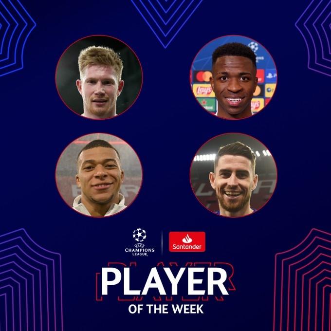 24直播网讯北京时间4月8日,欧足联官方公布欧冠本周最佳球员候选,德布劳内、姆巴佩、维尼修斯和若日尼奥入围。