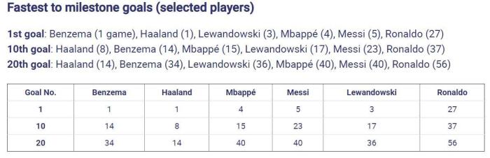 20球:哈兰德(14场),本泽马(34场),莱万多夫斯基(36场),姆巴佩(40场),梅西(40场),C罗(56场)