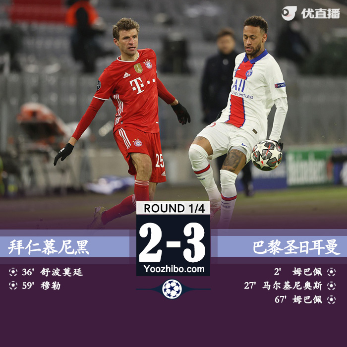 拜仁2-3巴黎 姆巴佩双响内马尔两助攻穆勒破门