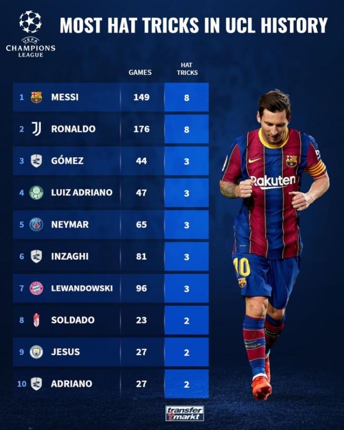 欧冠赛场上球员帽子戏法次数排行,梅罗均8次戴帽并列第一!