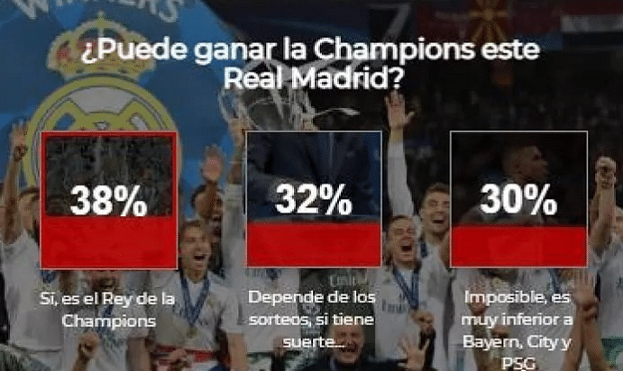 马卡电台的民意调查是在抽签之前进行的,38%的球迷认为皇马可以夺冠,这样的数据还是很高 ,可见西班牙人的球迷们还是很看好本届欧冠皇马的捧杯之旅。