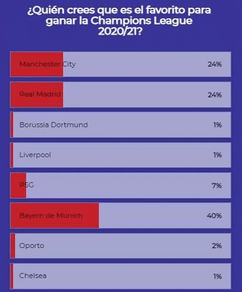 值得一提的是球迷们对于皇马也是很看好的,根据《马卡报》民调显示,皇马夺冠支持率升至第2位,皇马与曼城以24%的球迷票选并列夺冠热门第2,仅次于卫冕冠军拜仁的40%;