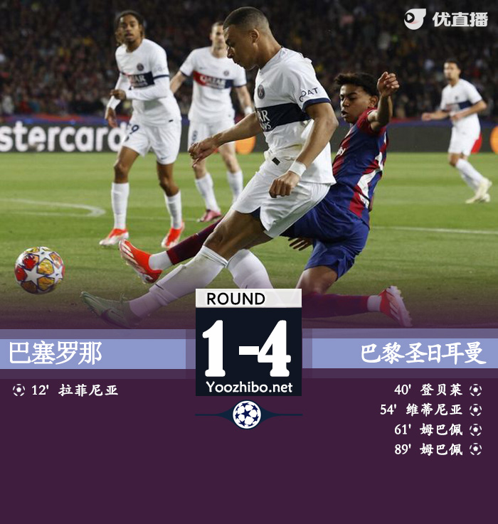 场比赛结束,巴黎客场4-1战胜十人巴萨。