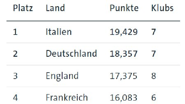 这意味着德甲将与意甲一样,获得2024-25赛季改制后的第1届欧冠中的5个席位。目前已锁定本赛季德甲前五的斯图加特、莱比锡和多特蒙德,与勒沃库森和拜仁,将确定一起晋级下赛季欧冠。