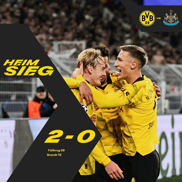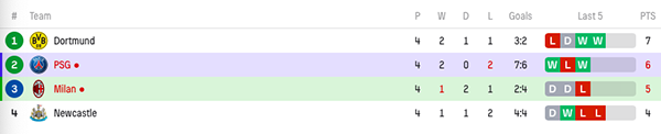 而在稍早结束的另外1场比赛中,回到主场的多特蒙德2-0完胜纽卡,主客场双杀了对手。如此一来,该小组的出线形势彻底乱了。目前多特蒙德积7分领跑,大巴黎则是6分,米兰首胜后拿到5分上升到第3,而上轮前还是小组头名的纽卡则跌至垫底。4轮过后没有球队出线,也没有球队出局,最后2轮场场都是生死战。