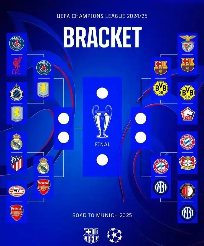 24直播网讯本赛季欧冠联赛八强对阵出炉:拜仁vs国米、巴萨vs多特、巴黎vs维拉、阿森纳vs皇马