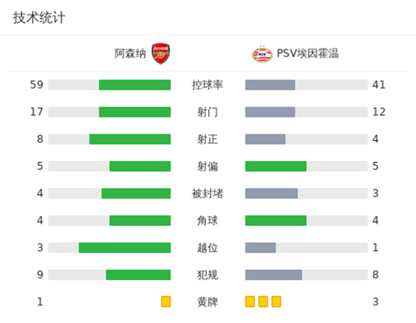全场比赛结束,阿森纳4-0埃因霍温。