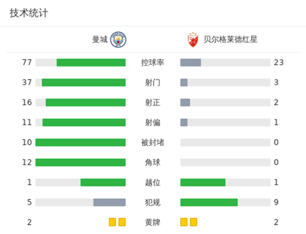 全场比赛结束,最终曼城3-1贝尔格莱德红星。