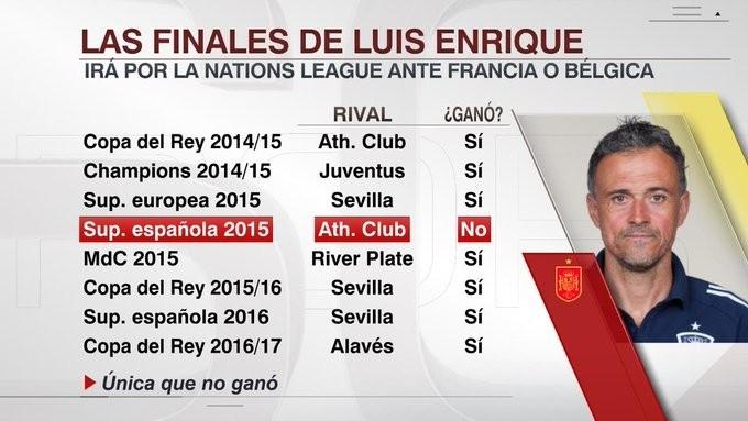 西班牙媒体统计,恩里克的执教生涯一共8次带队进入杯赛决赛,分别是14-15赛季带领巴萨进入国王杯比赛,最终巴萨夺冠,第二次是14-15赛季带领巴萨进入欧冠决赛,最终他们战胜尤文夺冠。第三次是15年的欧洲超级杯,他带队战胜塞维利亚夺冠,第四次是15年的西班牙超级杯,他执教的巴萨不敌毕尔巴鄂竞技,这是恩里克执教生涯唯一一次在杯赛决赛输球。跟着15年世俱杯,恩里克带领巴萨战胜河床,拿到世俱杯冠军。第六次是15-16赛季国王杯,恩里克带领巴萨战胜塞维利亚夺冠,第七次是16年西班牙超级杯,他带领巴萨战胜塞维利亚夺冠,第八次是16-17赛季国王杯,恩里克带领巴萨战胜阿拉维斯夺冠。