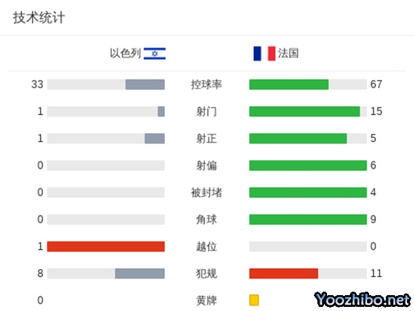 第6分钟,法国策动攻势,穆阿尼禁区内回传,跟进的卡马文加起脚远射,这球对方门将扑到但脱手了,球仍然进入球门,法国1-0以色列。