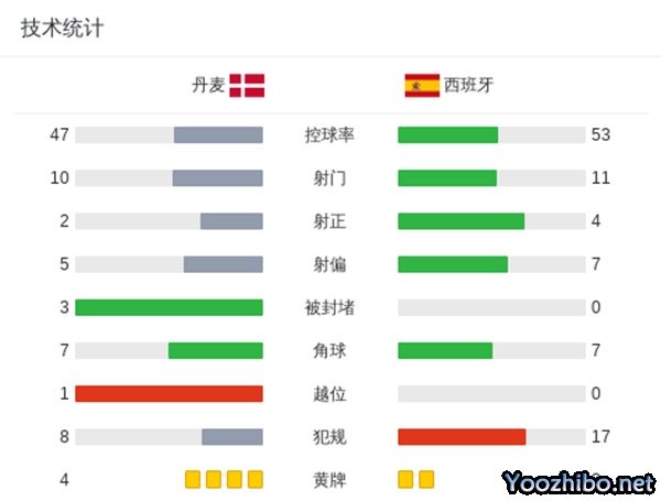 第15分钟,丹麦后场出球失误被断,西班牙就地组织进攻,连续的一脚触球渗透进禁区,最终由阿约泽助攻奥亚萨瓦尔低射入网,西班牙1-0领先。