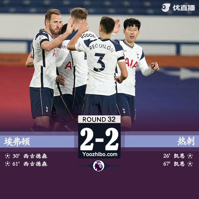 24直播网4月17日讯 北京时间4月17日凌晨3点整,2020-21赛季英超32轮焦点战在古迪逊公园球场展开角逐,埃弗顿坐镇主场迎战热刺。上半场凯恩首开纪录,雷吉隆送点,西古德森点射扳平,下半场西古德森反超比分,凯恩再入一球后伤退。最终热刺客场2-2战平埃弗顿,热刺联赛连续三轮不胜,埃弗顿五轮不胜。积分榜方面,热刺积50分距前四5分,埃弗顿积49分位列第8名。