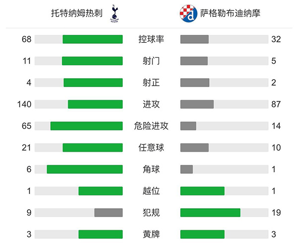 全场比赛结束,热刺主场2-0战胜萨格勒布迪纳摩,占得先机。