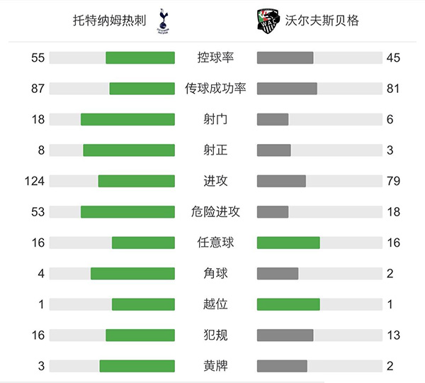 全场比赛结束,热刺4-0大胜沃尔夫斯贝格,两回合8-1晋级16强。