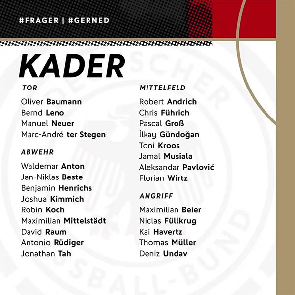 德国国家队名单公布:克罗斯回归战法国,多特仅一人进入