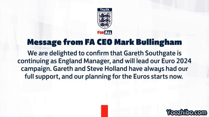 24直播网12月18日讯 英足总官方宣布索斯盖特留任,将带队参加2024欧洲杯!