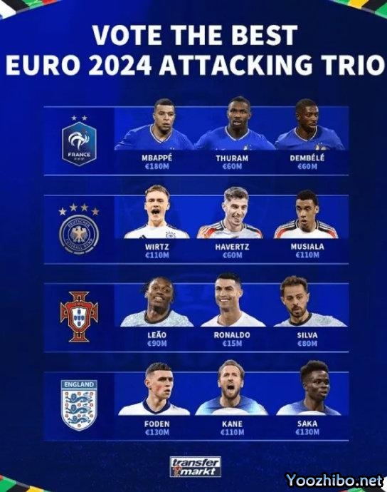 来源:24直播网03-31 16:4924直播网讯 德国欧洲杯将在今夏举行,《转会市场》也列出了四大强国的前场三叉戟组合,并提问“哪个组合最强?”