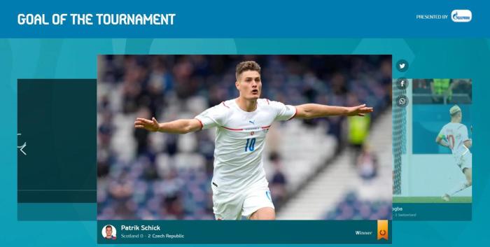 官方:希克45米吊射当选本届欧洲杯最佳进球