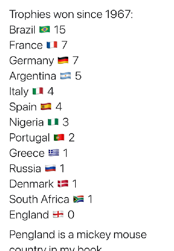 而其他球队排名阿根廷拿到5个冠军,意大利和西班牙4个冠军,尼日利亚3个冠军,葡萄牙2个冠军.....而到最后英格兰是0冠。不过,这里似乎漏掉了亚洲球队,看来他们没有把亚洲杯这些赛事放入其中啊。当然,无论怎么算都无所谓,毕竟这是用来调侃英格兰队的统计。毕竟,英格兰本届欧洲杯决赛的表现真的不怎么样,球员表现一般,主帅表现更是灾难,这种情况下也难怪各大媒体都在调侃英格兰。