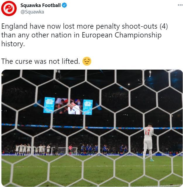今天凌晨,英格兰在欧洲杯决赛中点球被意大利淘汰,无缘在本土举起冠军奖杯。