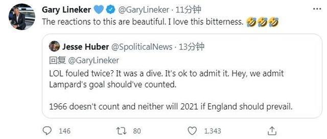 有球迷对此评论道:“跳水就认了,没什么大不了的。我们也承认兰帕德那个进球应该算数。1966年的冠军不干净,如果2021年英格兰夺冠了,那也是不应该算的。”